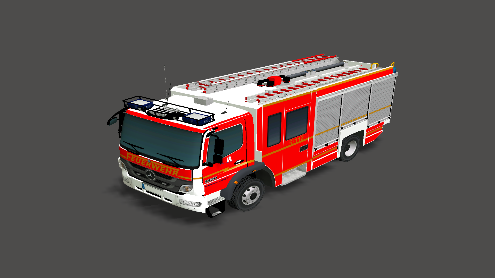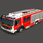 Mercedes-Benz Fahrgestell, aufgebaut auf einem Magirus AluFire 3-Aufbau, mit DBS 975-Balken an der Front und Hänsch Comet-S Blaulichttöpfen am Heck.