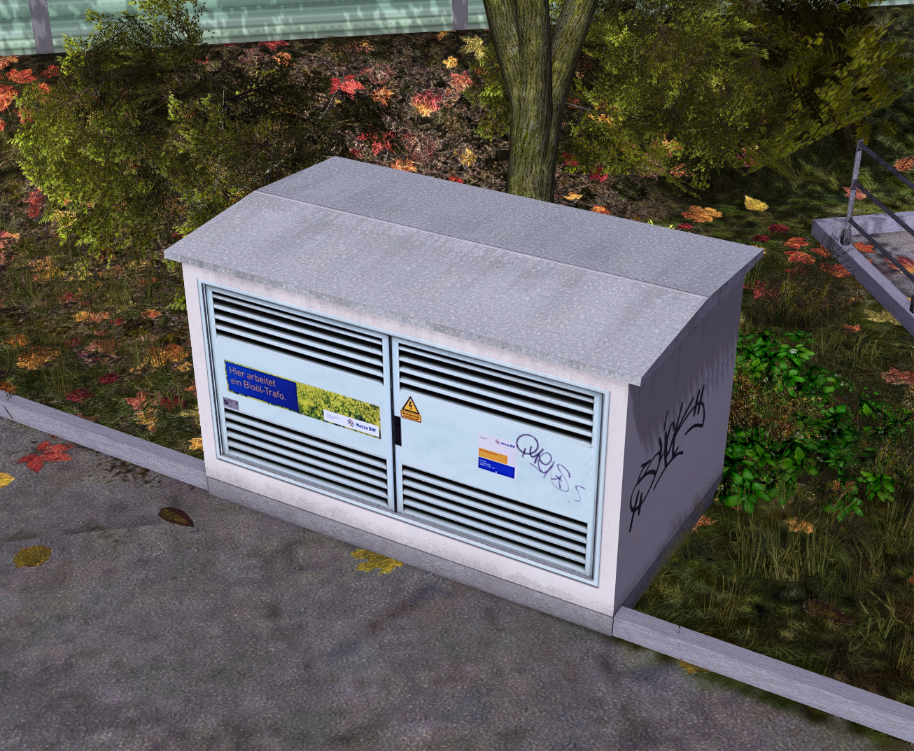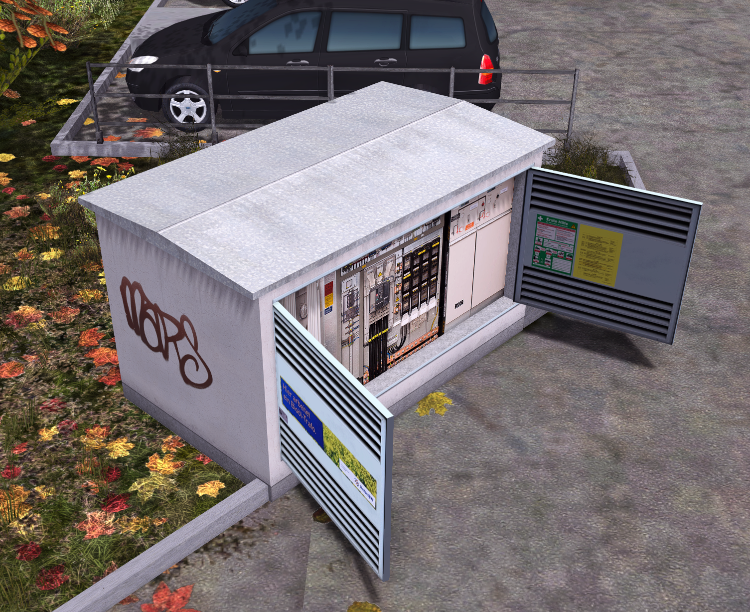 Eine kleine Trafostation mit animierten Türen und angedeutetem Innenleben.