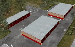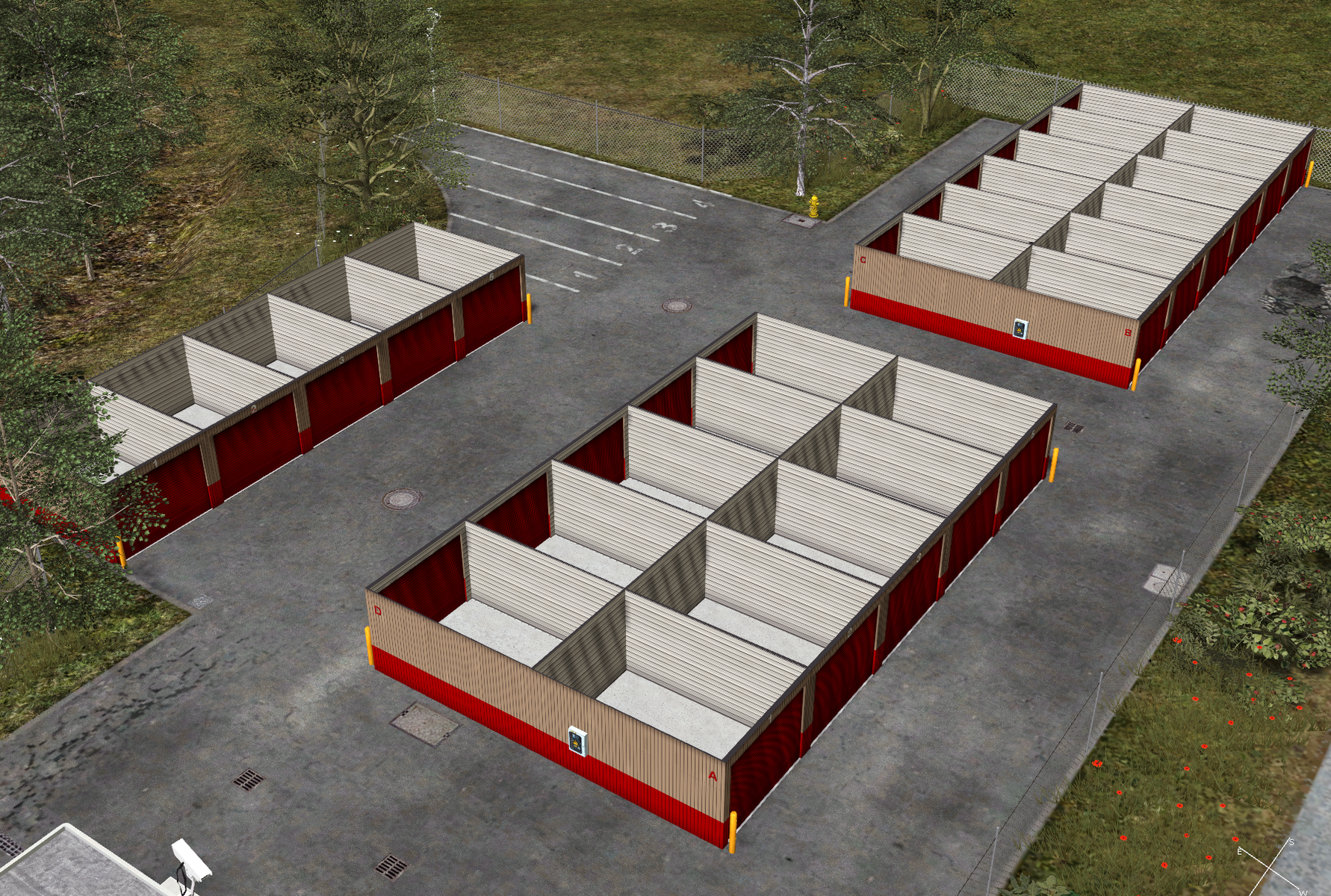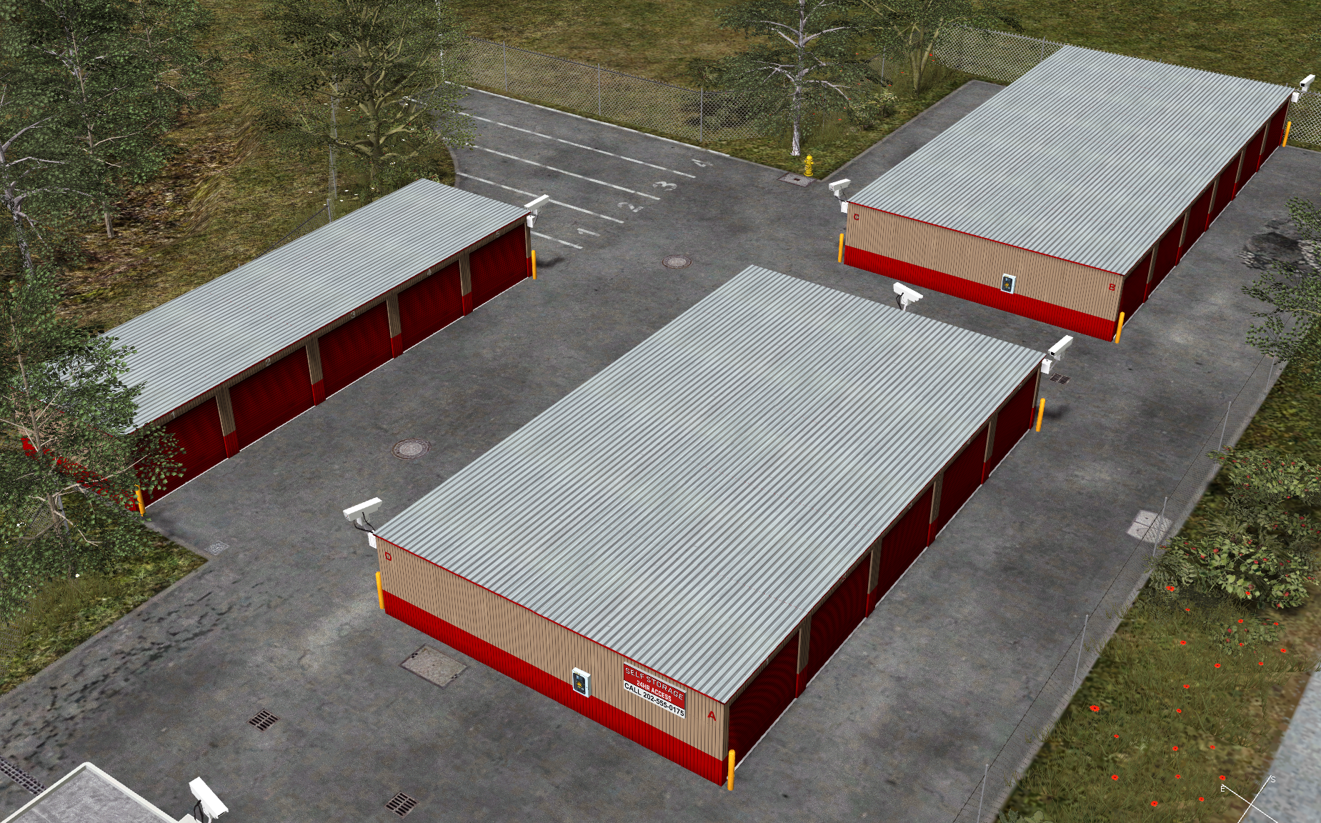 Open House Self Storage Garagen mit Schildern, sowie unterschiedlichen Markierungen als Childs. Die Überwachungskameras können in der LA-Mod gefunden werden.
