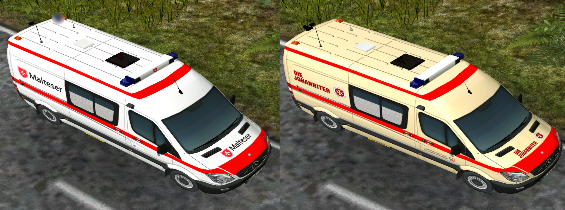 Es liegen Skins mit Logos von ASB, DRK, MHD und JUH bei, jeweils mit weißer Grundfarbe (BBK) oder elfenbein (Land NRW).