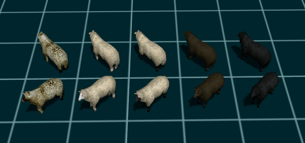 4 überarbeitete Schafstexturen (ganz links Original zum Vergleich)