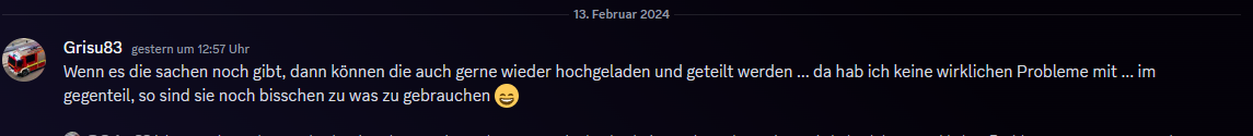 Hier mal ein aktueller Status: Grisu hat seine Sachen auf einer alten Festplatte, die irgendwo ausgebaut archiviert wurde :D Ich habe jetzt mal gefragt, ob ein ReUpload seiner Dateien von anderen erlaubt wäre :)