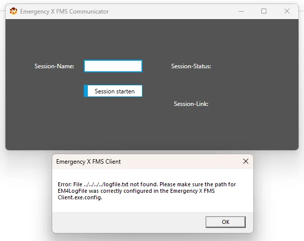 beim extra installierten FMS Tool von Emergency X (https://www.emergencyx.de/) wird eine Fehlermeldung gezeigt.