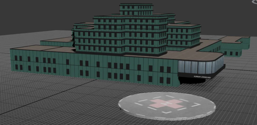 Anbei: Das Gebäude der Rettungswache 9 wäre eigentlich der "Augenarzt Notdienst". Wir brauchten jedoch auch Platz für den RD09 :D Das Haupt-Gebäude wurde auch in Richtung des Landeplatzes verkürzt. Sonst wäre das ein zu großer Mega-Komplex geworden, der zu viel Platz auf der Karte einnimmt :)