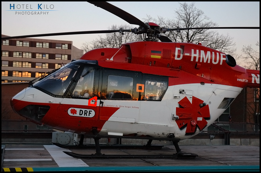Die D-HMUF, eine BK-117 B2 der DRF (S/N 7105) - hier als Christoph 42 noch auf dem Dachlandeplatz des damaligen Kreiskrankenhauses Rendsburg. Die Station wurde am 24.07.2020 an den Verkehrsflugplatz Rendsburg-Schachtholm (EDXR) verlegt, womit auch der Wechsel auf die EC145 einher ging. Die Maschine wurde 1986 in Deutschland als A3-Variante gebaut und war zum Zeitpunkt der Aufnahme also schon 22 Jahre alt. Die D-HMUF ist insofern besonders, als dass sie die einzige BK-117 war, die von einer Polizei-Landeshubschrauberstaffel (Bayern) beschafft und in Polizeidiensten auf den A4-Standard und bei der DRF auf den B2-Standard umgebaut wurde. Im Dezember 2012 wurde sie dann bei der DRF außer Dienst gestellt und nach Kanada verkauft. Dort flog sie als C-GGSA ab Januar 2013 zunächst für Great Slave Helicopters, wurde im Juli 2013 bei Airwork NZ in Neuseeland auf den 850D2-Standard umgebaut und ab September 2021 dann von Bighorn Helicopters Inc. wieder in British Columbia in Kanada eingesetzt. Die letzten registrierten Flüge der Maschine fanden 2023 statt.