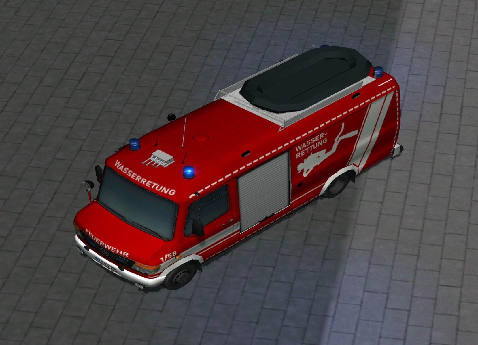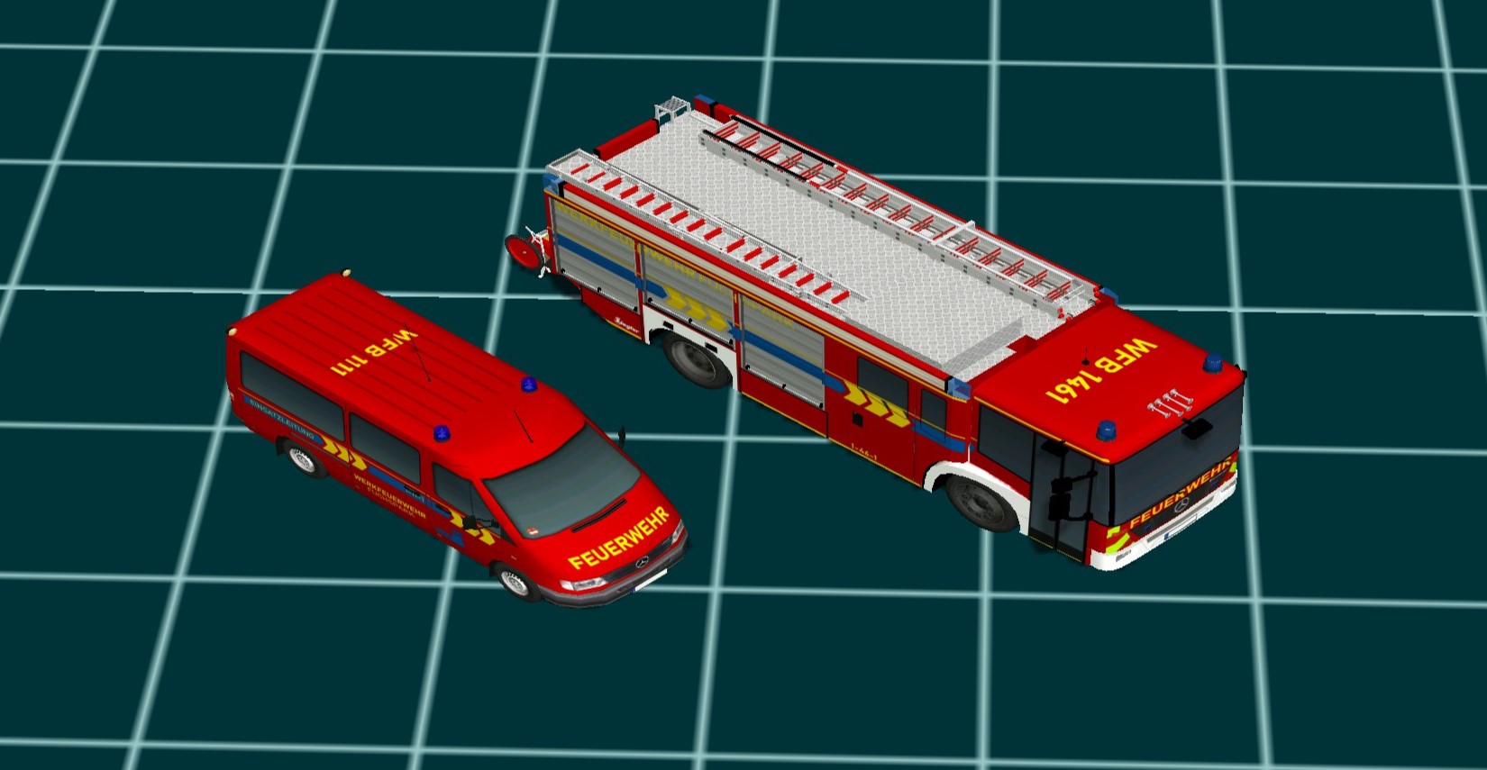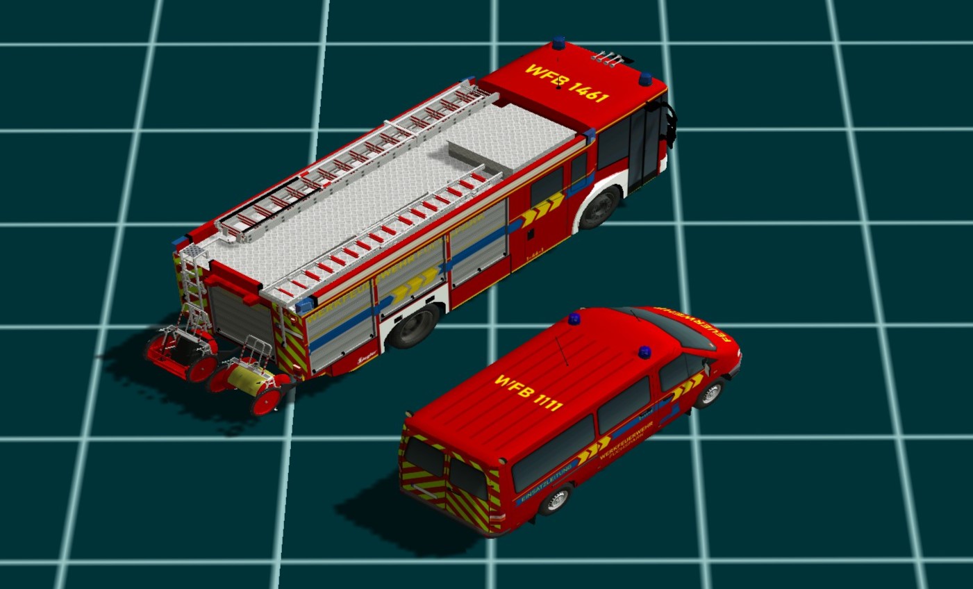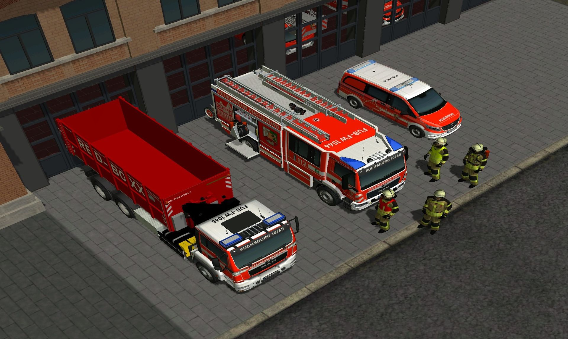 Die ersten Änderungen machen sich bei der hauptamtlichen Wache bemerkbar. Fahrzeugtechnisch wurde der BMW KdoW durch einen Mercedes Vito ersetzt. Das HLF bekam eine neue Kabine mit Anpassungen am Aufbau und Fahrgestell. Da der AB-Mulde überwiegend dazu dient, die Elektrofahrzeuge nach Bränden zu kühlen, habe ich das Modell minimal angepasst und diesem einen Red-Boxx Skin verpasst. Zudem lässt sich auch auf diesem Bild schon gut erkennen, dass die Feuerwehrleute ab sofort mit S-Guard Klamotten ausgestattet sind.