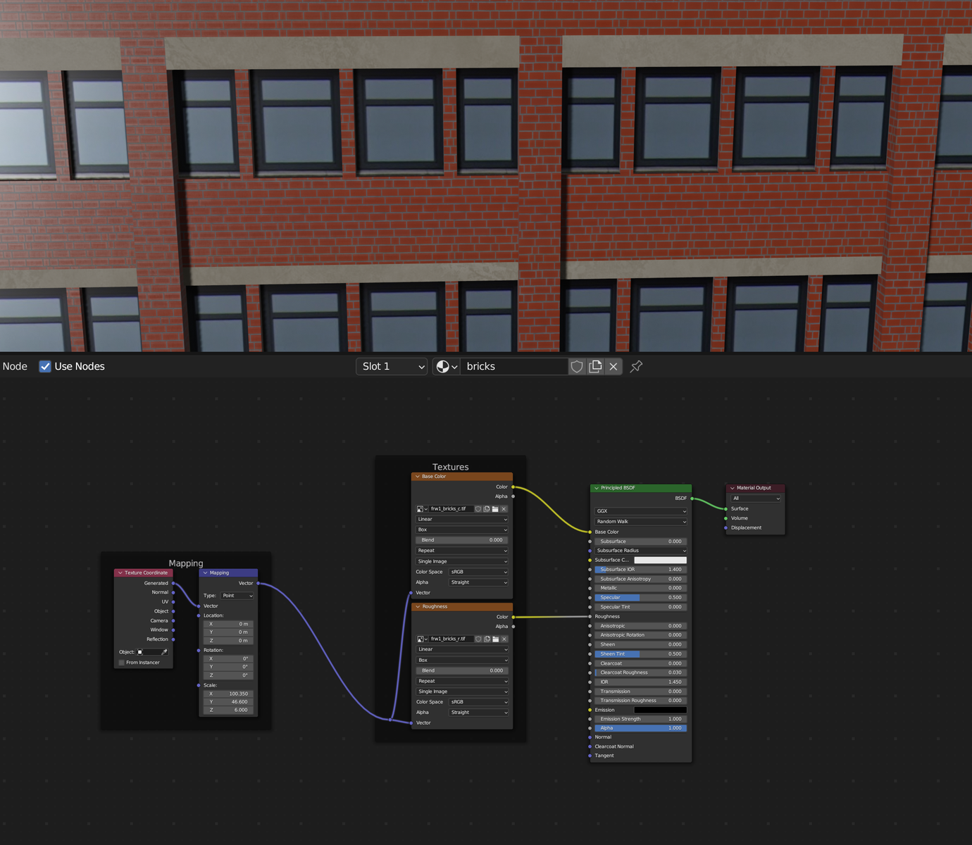 To avoid resource-intensive UV mapping, the material for the facade uses a texture coordinate mapping to project the PBR material onto the mesh.