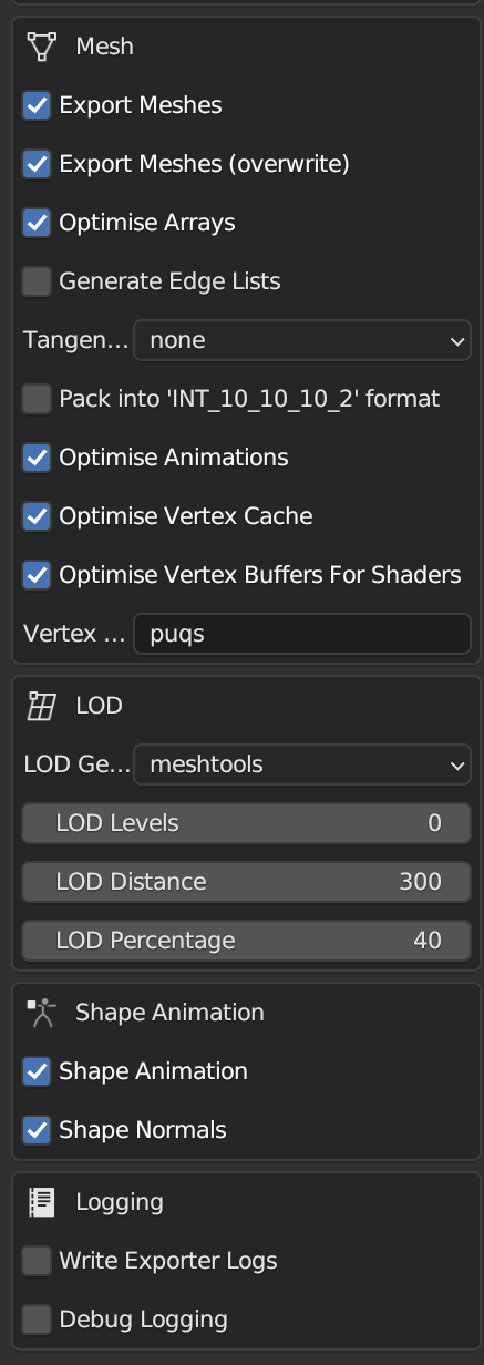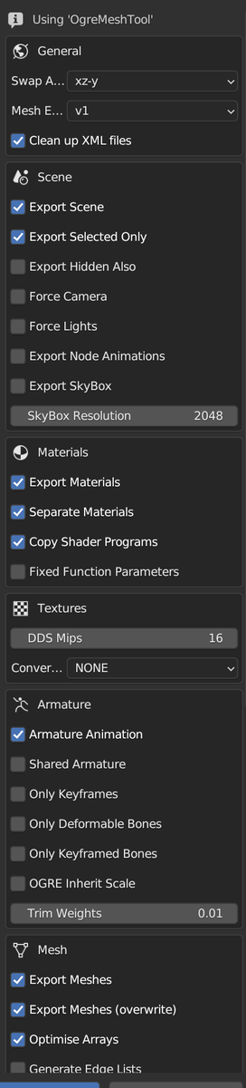 Die Einstellungen findest du, wenn du dein Object in Blender auswählst, dann File > Export > Ogre3D