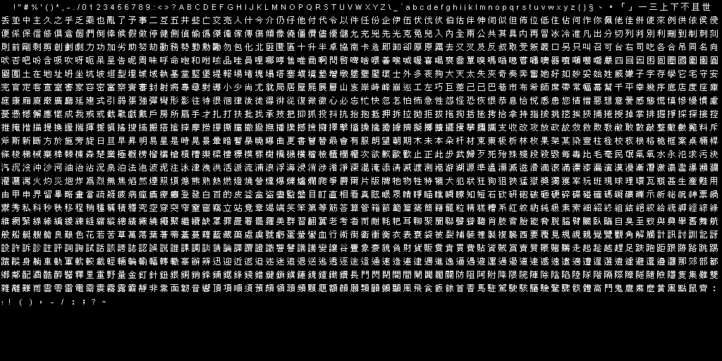 一三上下不且世丟並中主久之乎乏乘也亂了予事二互五井些亡交亮人什今介仍仔他付代令以件任份企伊伍伏伐伙伯估伴伸伺似但佈位低住佔何作你佩佬佳併使來例供依侯侵便係保信修俱倉個們倒倖候假做停健側偵偷偽傑備傢傳傷傾像僥僵價儘優儲允充兇先光克免兒入內全兩公共其具内再冒冰冷准凡出分切列判別利刪到制刺刻則前剛剩剪創劃劇力功加劣助努劫動務勢勤勳勵勿包化北匪匿區十升半卓協南卡危即卸卻厚原厲去又叉及反叔取受叛叢口另只叫召可台右司吃各合吊同名向吠否吧吩含吸吹呀呃呆呈告呢周味呼命咆和咐咳品哇員哩哪哮售唯商啊問啟啤啥喂善喉喊喔喜喝喪喬單嗅嗎嗡嗯嘗嘯噢器噴噸嚇嚨嚴四回因困固圈國圍園圓圖團土在地址坍坐坑坡坦型埋城域執基堂堅堡堤報場堵塊塌塔塞填境墊增墩墬壁壓壞士外多夜夠大天太失夾奇奏奔奮她好如妙妥始姓威嫌子字存學它宅守安完官定客宣室害家容密富察實審封射將專尋對導小少尚尤就局居屋屍展層山岌岸峙峰崩巡工左巧巨差己已巴巷市布希師席帶常幅幕幫干平幸幾序底店度座庫庭康廂廈廠廣廳延建式引弱張強彈彎形影往待很徊律後徒得徘從復微徽心必忘忙快忽怎怕怖急性怨怪恐恢恨恭息恰悅悉患您情惜惡想意愛感態慌慎慘慢慣慮憂憑憾懈應懷成我戒或截戰戲戴戶房所扇手才扎打扶批找承技把抑抓投抖抗抬抱抵押拆拉拋拒拔拖拘括拯拷拾拿持指按挑挖挨挾捕捲授掉掌排掘掙採探接控推掩措描提換握揣揮援損搖搜搞搬搭搶摔摩撈撐撕撞撤撥撫播撲撼撿擁擇擊擋操擒擔據擠擬擲擴擺擾攀攔攜支收改攻放政故效救敗教敝敢散敲整敵數斃料斥斧斯新斷方於施旁旋日旦早昇明易星是時晃景暈暗暫暴曉曝曲更書曾替最會有服朗望朝期木未本朵杆材束東板析林枚果架某染查柱栓校核根格桅框案桌桶桿條梭梯械棄棒棘棟森楚業極概榜榴構槍槓槽樂樑樓標模樣樹橋機橫檔檢櫃欄權次欲歉歐歡止正此步武歸歹死殆殊殘段殺毀每毒比毛毫民氓氣氧水永氾求污決汽沉沒沖沙河油治沾況泉泊法泡波泥注泳津洩洪活派流浦浪浮海浸消涉淆淨深混淹添清減渡測港游湖源準溫溺滅滋滑滴滾滿漂漆漏演漠漫漸潛激濃濫瀑瀕瀰灌灑灣火灼災炮炸為烈無焦焰然煙照煩熄熊熟熱燃燈燒營燻爆爍爐爛爬爭爵爾片版牌牠物牲特犧犬犯狀狂狗狙狹猛獄獎獨獲率玩班現球理環瓦瓶甚生產甦用由甲申界留畢略畫當疏疑疲病瘋瘓療癱登發白百的皮益盒盜盡監盤目盯直相看真眩眼眾睛睜瞄瞧瞬瞭知短石砍研砲破砸硬碎碟碰確碼礙礦礫示祈祕祝神票禍禦秀私科秒秩移程稍種稱積穩究空穿突窄窒窗竊立站竟章竭端笑笨第等筋答算管箱節範篇築簡籍籠粒精糕糟系紅紋納純級素索細紹終組結絕絞給統綁經綜綠維網緊線緣編緩練縫縮縱總績織繞繩繫繼續缺罩罪置署罷羅美群習翻翼老考者而耐耗耙耳聊聚聞聯聲聳聽肖肢背胎能脅脫腦臂臟臥臨自臭至致與興舉舊舞航般船艇艘艙良艱色花若苦草萬落葉著蒂蓋蔓藉藍藏藥處虞號虧蛋螢蠻血行術街衛衝衡衣表衰袋被裂補裝裡製複襲西要覆見規視親覺覽觀角解觸計訊討訓記訝設許訴診註評詞詢試話該誇誌認誤說誰課調談請論諜謂證識警譬議護變讓谷豐象豪貌負財貨販貫責買費貼資賊賞賣質賬賭購走起趁越趕足跌跑距跟跡路跳踢蹟蹤身躺車軌軍軟較載輕輛輪輸輻轉轍辜辦辨迅迎近返迫述迷追退送逃透逐途這通速造連逮週進逸逼遇遊運過遏道達遞遠遣適遭遲選遺遽避還邊邏那郊部都鄉鄰配酒酷醉醫釋里重野量金釘針鈕銀銅銷鋒鋪鋸錄錢錯鍵鎖鎮鏈鏡鐘鐵鑽長門閃閉開間閘闆闊關防阻阿附降限院陣除陰陷陸隊階隔際障隧隨險隱隻集雖雙雜離難雨雲零雷電需震霧露霸靜非靠面韌音響頂項順須預頗領頭頻顆題額顏願類顧顫顯風飛食飯餘首香馬駐駕駛駭驅驗驚驟骸體高鬥鬼鷹麻麼黃黑點鼠齊