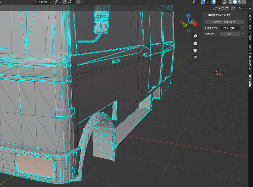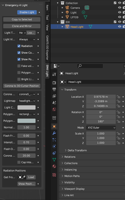Gut bin dezent schlecht im erklären, du importierst das zu lightende Fahrzeug. Da gehst dann in den Edit mode und wenn die Erweiterung auch in den Settings aktiv ist hast du in deinem Workbereich wenn du N drückst auf der rechten seite "Em4 Light" stehen. Du wählst dann im Flächenmodus deine Lichtfläche aus und gehst auf create Light. Das erstellt dann ein weiteres "modell" welches dann dein Licht ist und das kannst du in Blender dann einstellen wie im EM Editor.