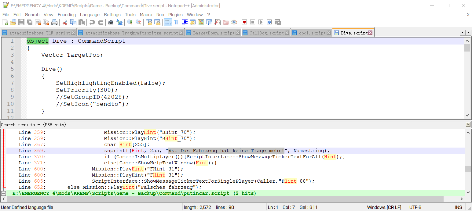 I've made Chinese translation for Fuchsburg and Kregen mod before, some text information was written in the scripts (and some modder might wrote it into the xml files in "UI" folder), you can open all the .script files with Notepad++, and then search words like: "hint", "text", "help", "snprintf" with the "Find All in All Opened Documents" buttom, and you will see most of them below.