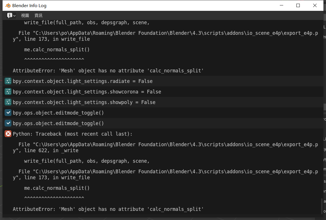 AttributeError: 'Mesh' object has no attribute 'calc_normals_split'I'm sure the metarial has already changed to English name, so it shouldn't be "no-ansi/latin-1" problem.