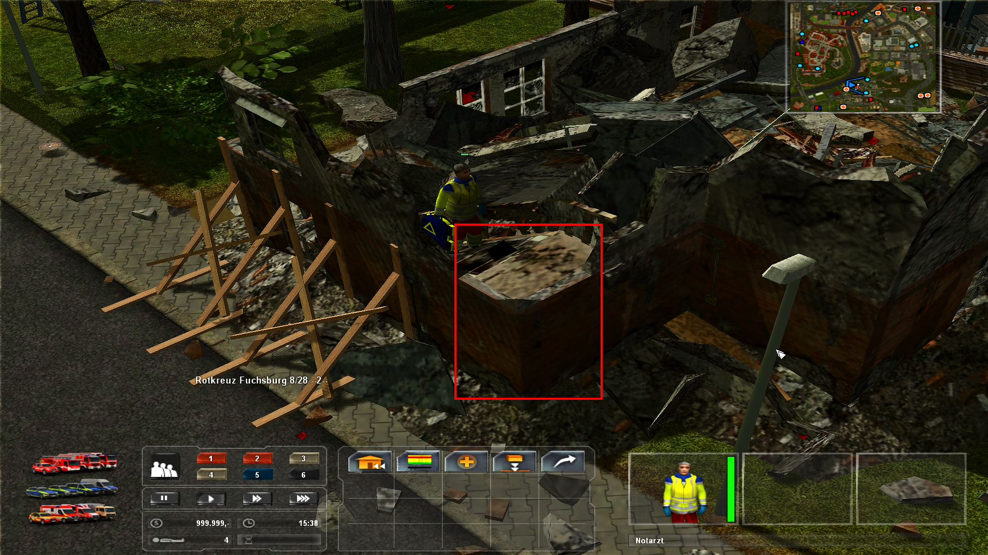Beim Einsatz Eingestürztes Haus ist in einer Treppe in der Ecke ein Verletzter, an die man nicht ran kommt. Mein LNA ist beim Sichten an den Punkt gelaufen, wo der liegen soll. Wenn ich ganz nah ranzoome, befindet sich unter der Treppe der Verletzte, welcher wiederum unter einem Stein liegt. So wie auch die anderen Personen im und ums Haus verteilt. Ich hab alles probiert. Kran, THW, DLK, Hubschrauber, alle Arten von Equipment und alle mir bekannten Tricks, aber man kommt ums Verrecken nicht dran. Den Einsatz kann ich dementsprechend nur manuell beenden