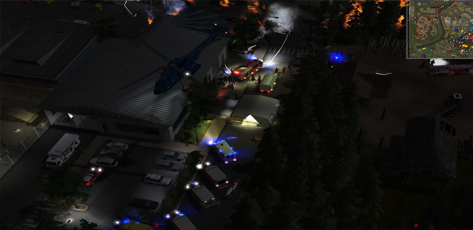 Da der Hubschrauber der Bundespolizei anderweitig gebunden war, wurde die Brandbekämpfung vorerst vom Boden aus durchgeführt. (Er verfolgte ein Objekt am Kartenrand und wir konnten ihn erst später wieder steuern ;D) Das THW unterstützte mit Beleuchtung und Brandschneisen. Das DRK richtete eine Sammelstelle für Verletzte ein. Obwohl das Industriegebiet vorerst gehalten werden konnte, entzündete sich ein Gastank, der sämtliche Feuerwehrmänner aus Unteringen erfasste. Das LF 8/6 brannte komplett aus. Auch eine RTW Besatzung erlitt eine Rauchgasvergiftung. Es wurde ein Rückzug für die Kräfte aus Obderdamm angeordnet. Vor Ort bildete sich ein Gruppe von Gaffern, die leider der Aufforderung der Polizei zu gehen nicht nachkamen. Viele erlitten eine Rauchgasvergiftung sowie einige Verbrennungen, als diese zu nah an den Brand herantraten. Die Brandopfer sowie die verletzten Kameraden wurden gerettet und behandelt, einige schwer Verletzte wurden per Hubschrauber ins Bundeswehrkrankenhaus geflogen.