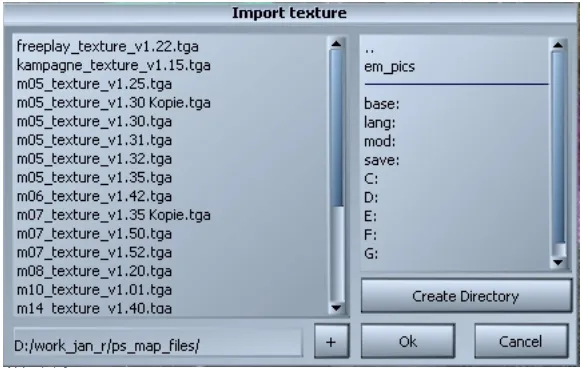 - Die selbst erstellte Bodentextur kann folgendermaßen im „Edit / Terrain“- Modus (Funktionstaste F2) importiert werden: Floor -> Import texture Rechts: Verzeichnis, in dem sich die TGA-Textur befindet auswählen (z.B. „maps“) Links: TGA-Datei, z.B. „example.tga“, markieren -> Auf OK klicken (s. Abb. 1)