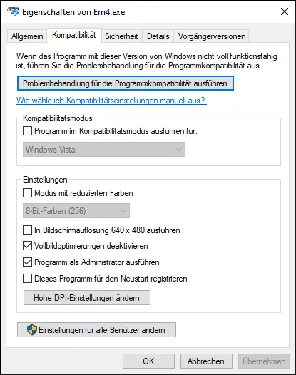 Geht in das Hauptverzeichnis von Emergency 4 und macht einen Rechtsklick auf Em4.exe. Danach wechselt ihr auf den Reiter Kompatibilität und selektiert dort Vollbildoptimierungen deaktivieren und Programm als Administrator ausführen. Einmal übernehmen, dann OK und schon sollte Emergency 4 wieder wie gewohnt im Vollbild mit euren Settings laufen.