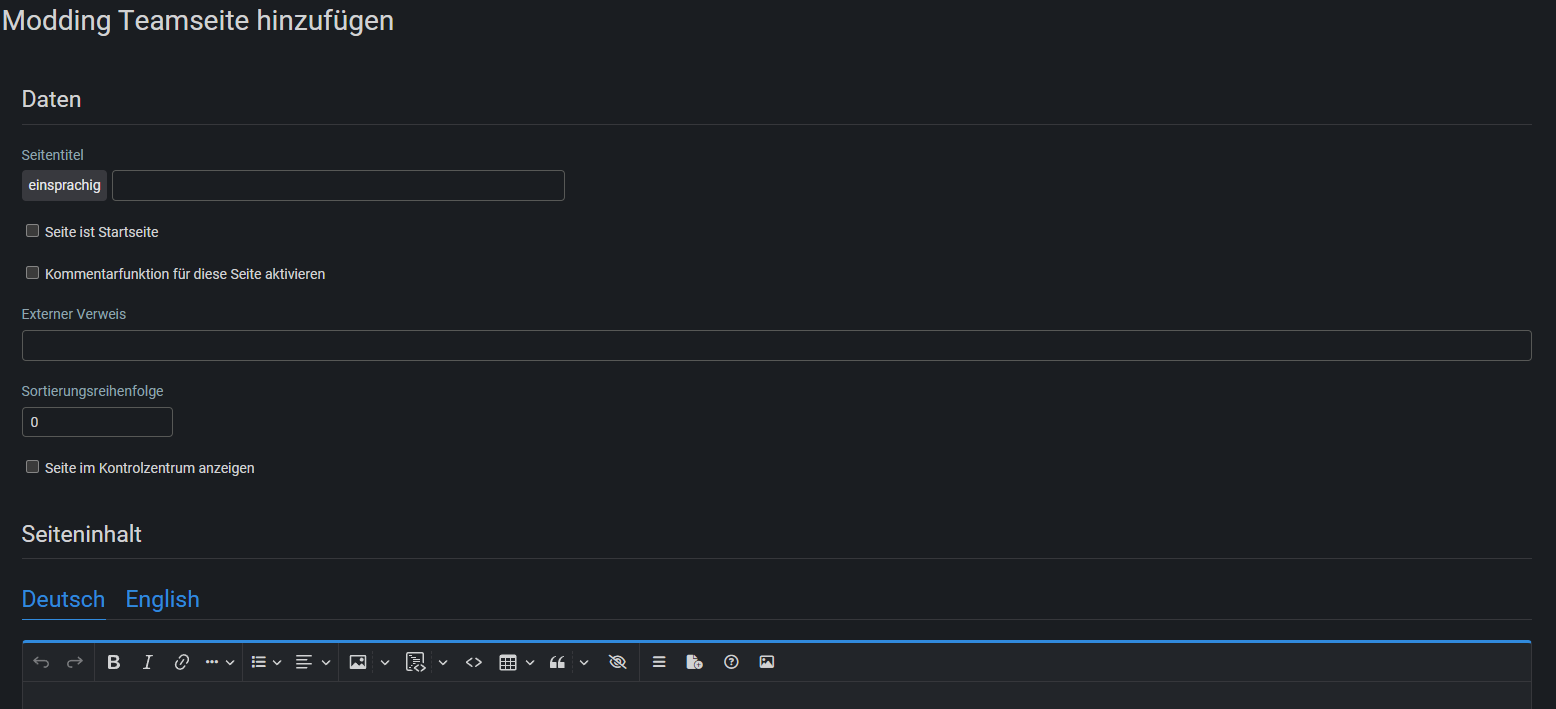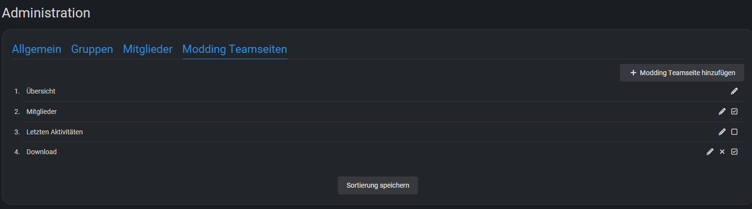 | Administration: | Hier kannst du dein Modding Team administrieren. Du kannst Seiten bearbeiten, Team-Mitglieder einladen, Rollen vergeben, ... |