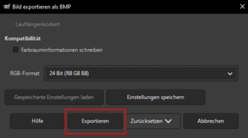 Ich geh jetzt davon aus, das ihr die Textur schon erstellt habt -> Ihr geht unter "Datei" in den Reiter "Exportieren nach" -> linke Maustaste auf "Dateityp: Nach Endung" -> scrollt solange bis ihr "Windows-BMP-Bild" bzw. "bmp" findet -> wählt "Windows-BMP-Bild" bzw. "bmp" aus -> linke Maustaste auf "Exportieren" -> stellt beim RGB-Format "24 Bit (R8 G8 B8)" ein -> linke Maustaste auf "Exportieren" -> Öffnet die exportierte ".bmp" und geht wieder unter "Datei" in den Reiter "Exportieren nach" -> linke Maustaste auf "Dateityp: Nach Endung" -> scrollt solange bis ihr "TarGa-Build" bzw. "tga" findet -> wählt "TarGa-Build" bzw. "tga" aus -> linke Maustaste auf "Exportieren" -> nehmt dann den Haken bei "RLE-Komptression verwenden" raus -> Linke Maustaste auf "Exportieren"