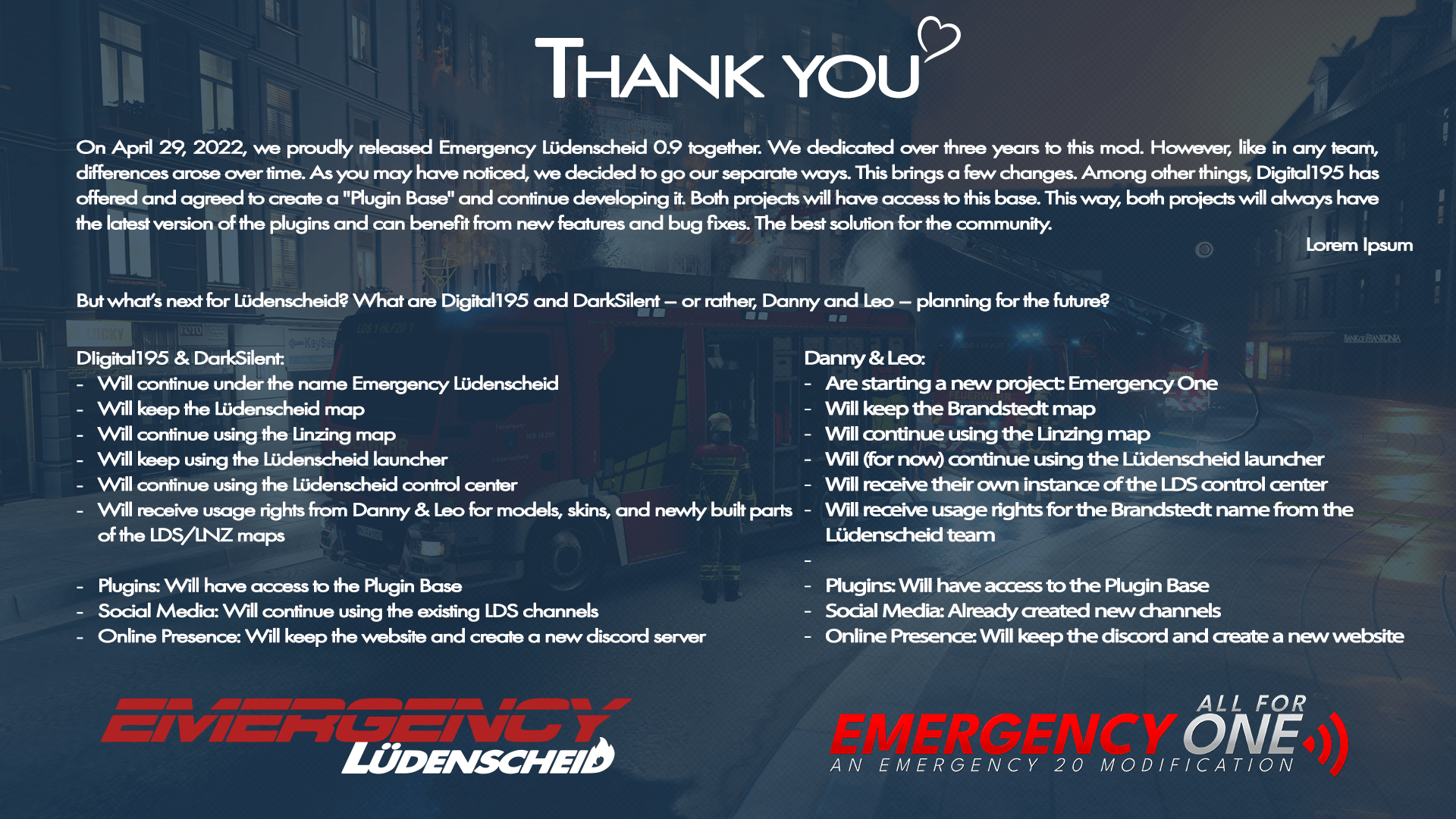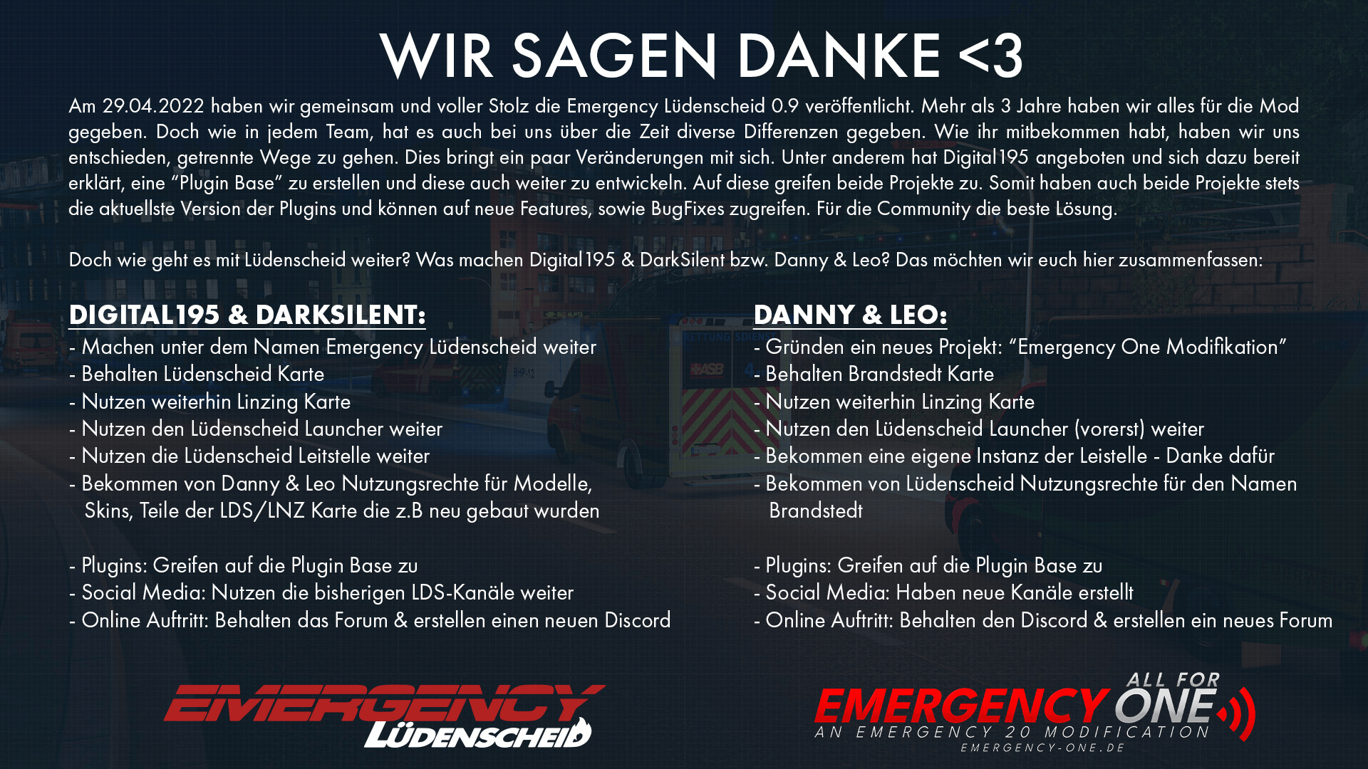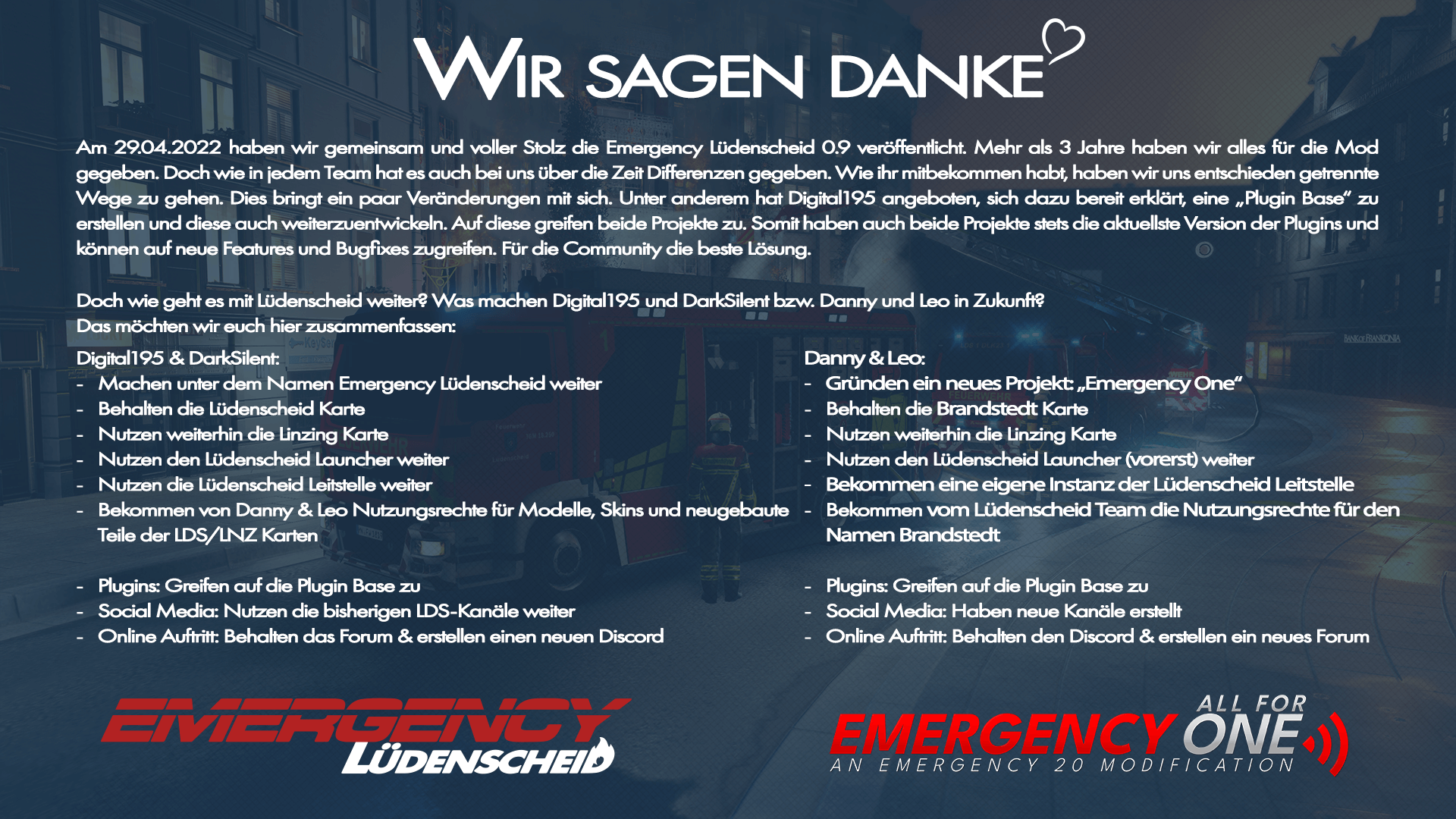 Mehr als drei Jahre Entwicklungszeit stecken in Emergency Lüdenscheid. In den letzten Wochen haben sich allerdings intern einige Differenzen abgespielt, die zu einer Trennung führten. Trotz vieler Gespräche, auch unter Bezug einer Vermittlerperson, konnte man sich nicht mehr auf ein gemeinsames Projekt einigen. Doch es gibt auch positive Nachrichten für die Community: Lüdenscheid wird es weiterhin geben, dazu gesellt sich dann ein neues Projekt - also zwei Projekte für die Emergency 5 / 20 Reihe.